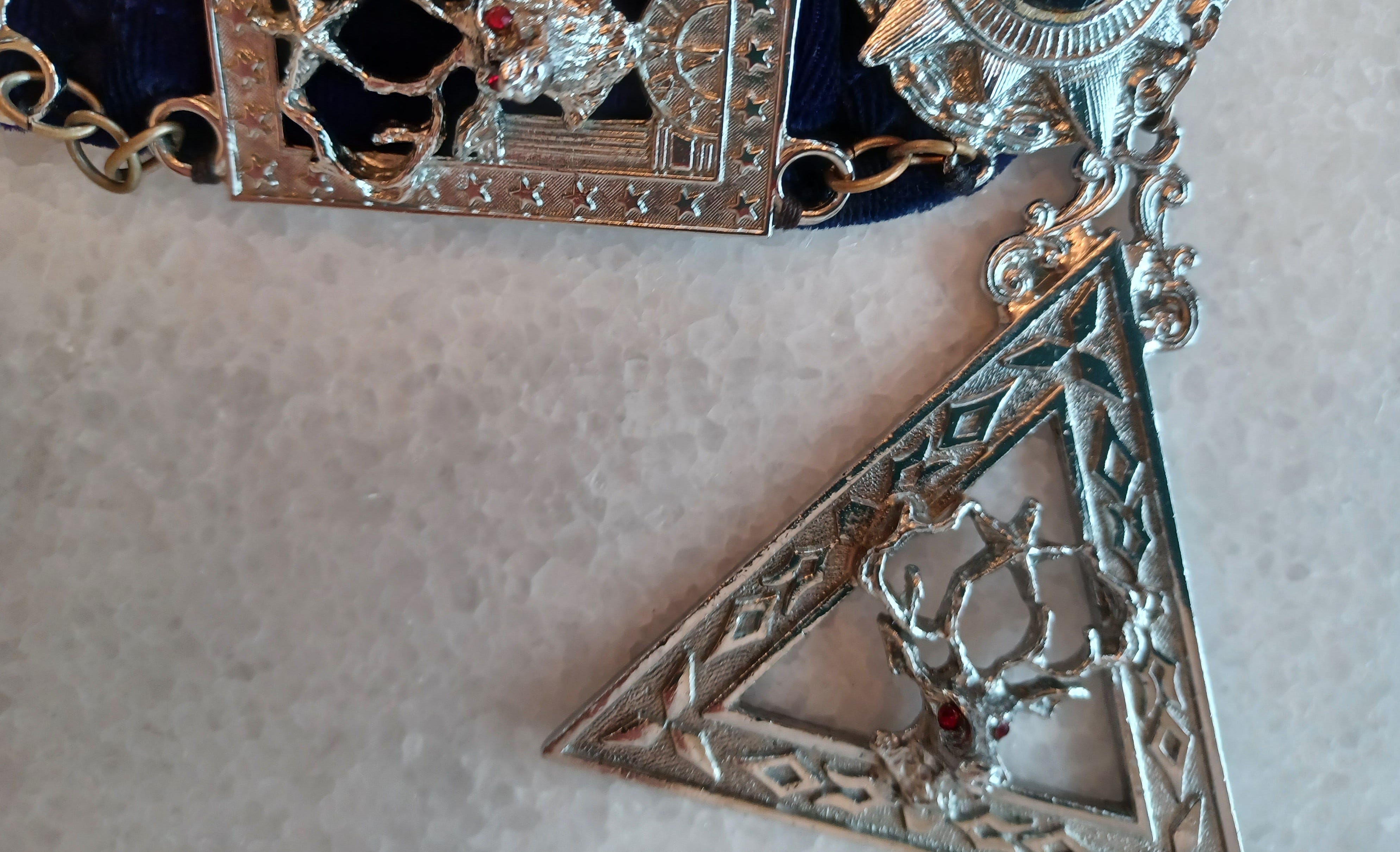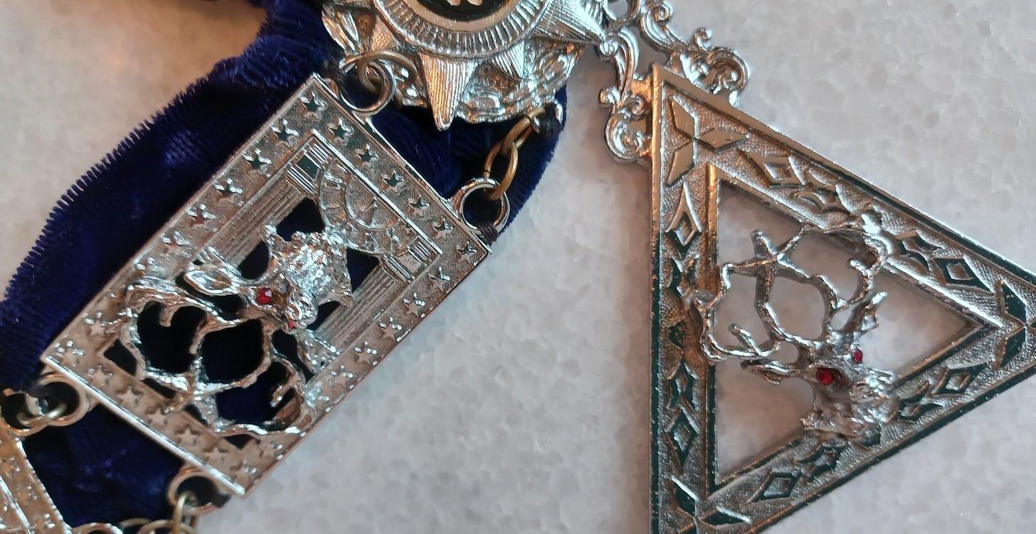 Hand-wrought in the fog of Arthurian times, the necklace features sixteen linked amulets, each depicting an eight-point stag holding a pentagram aloft in its antlers. These are sewn to a band of rich, purple velvet, the cloth of kings. Dangling at the bottom is a triangular pendant. All elements are marked with occult stars and Roman numerals, whose meaning has been lost to time.